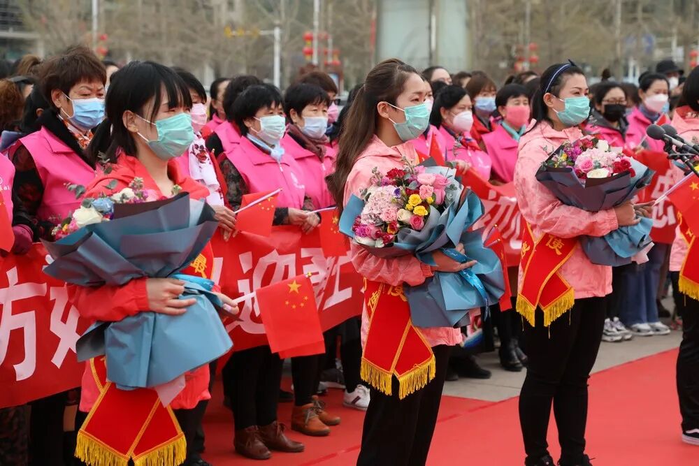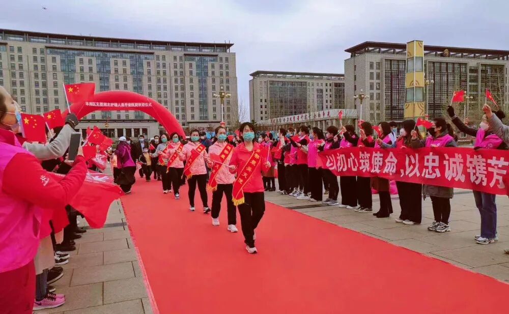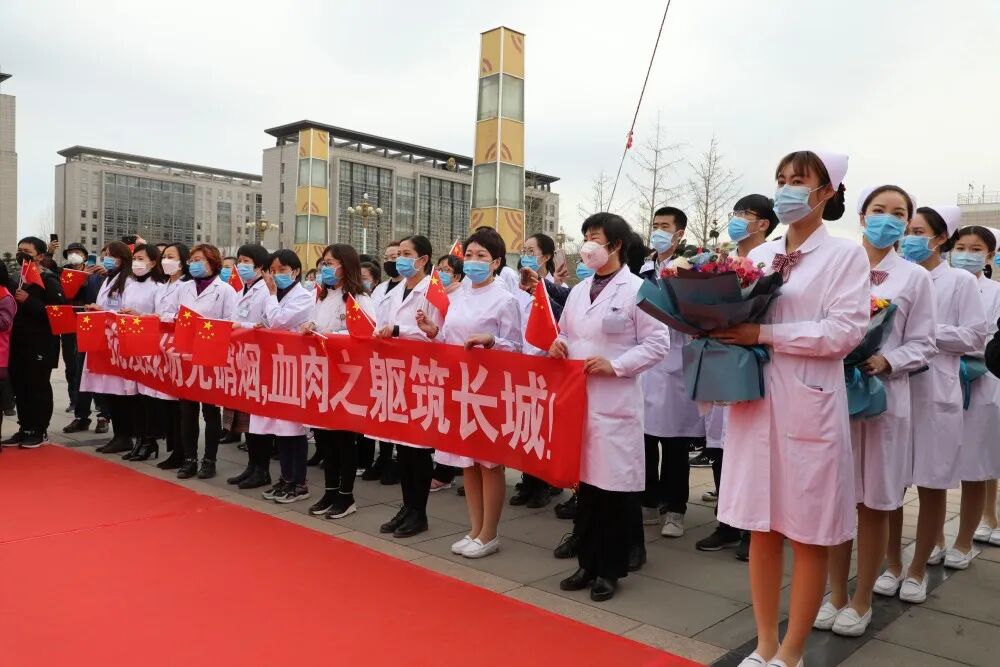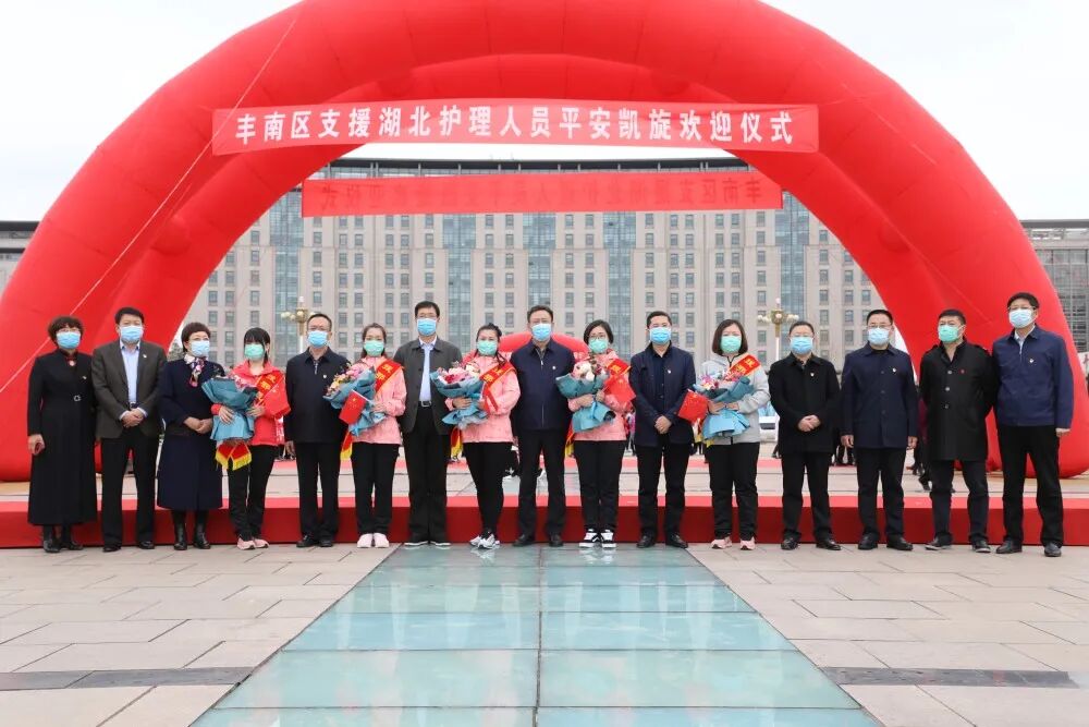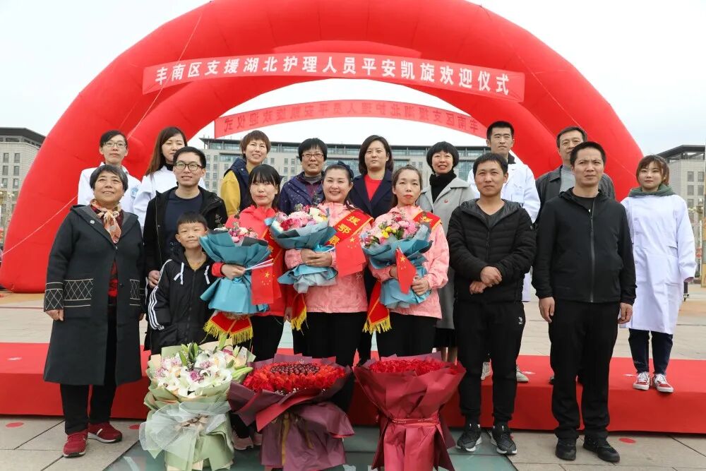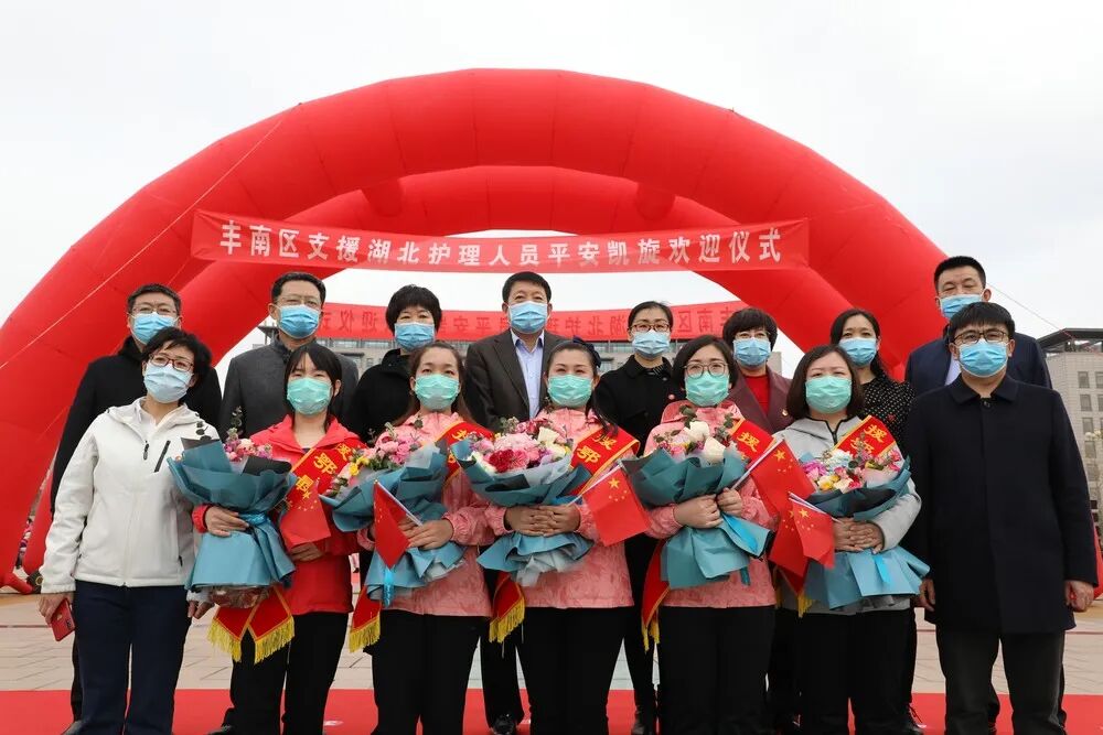 为迎接抗疫战士,丰南区区委区政府在惠丰湖广场专门为她们举办了热烈的欢迎仪式,由赵立华区长主持,区领导为她们送上鲜花,丰南医疗队队长曹美元、区委书记艾春相继发言。欢迎现场“英雄凯旋”“欢迎回家”等大幅标语在阳光下格外耀眼。《我和我的祖国》歌声嘹亮,欢迎群众挥舞国旗,手举“抗疫战场无硝烟、血肉之躯筑长城”等红色横幅,高喊“欢迎回家、向你们致敬”,表达对援鄂英雄的崇敬之情,很多人留下了激动的泪水,现场氛围十分热烈和感人。